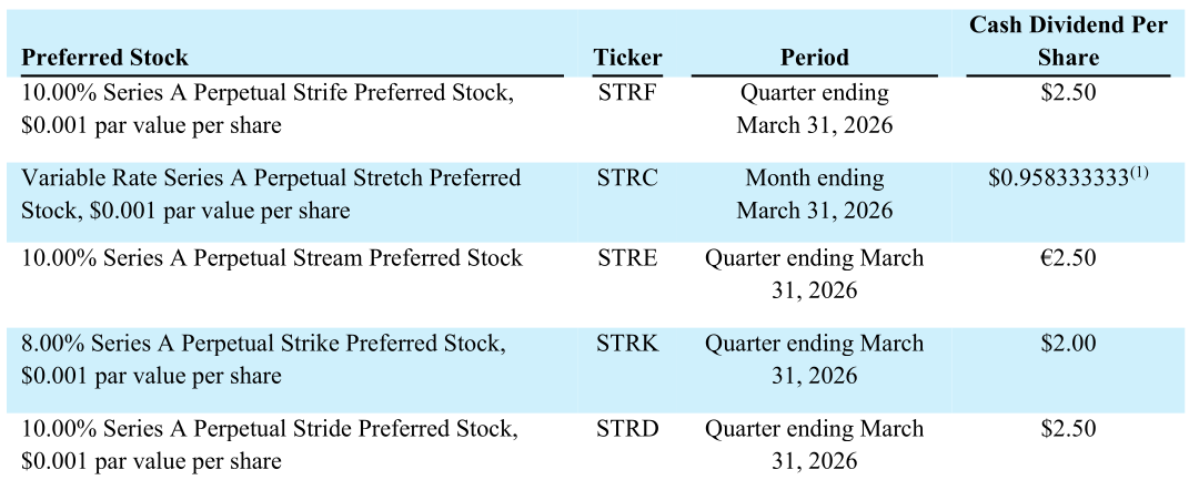 3. Preferred Stock (STRK & STRF) Recently, MSTR introduced preferred stocks. These offer a fixed dividend yield (appealing to traditional fixed-income investors) and, in the case of STRK, the option to convert into common stock at a very high future price. For common shareholders, this is fantastic news because it raises capital with zero immediate dilution to the common stock.
